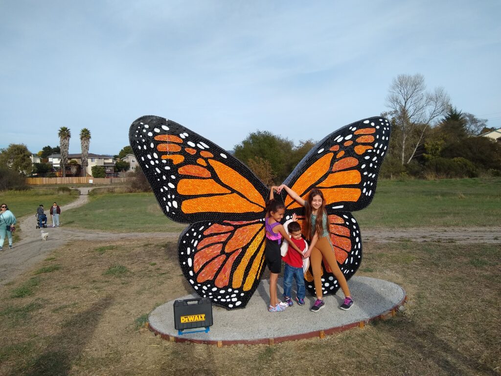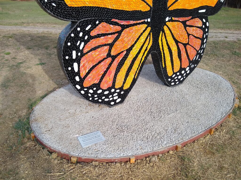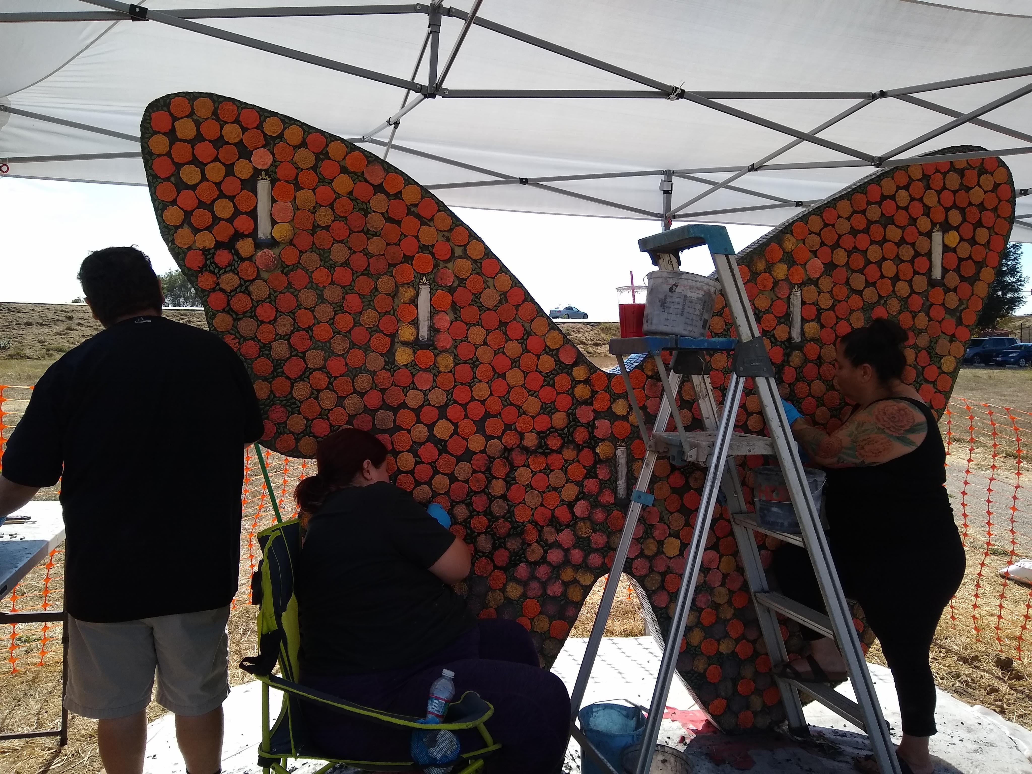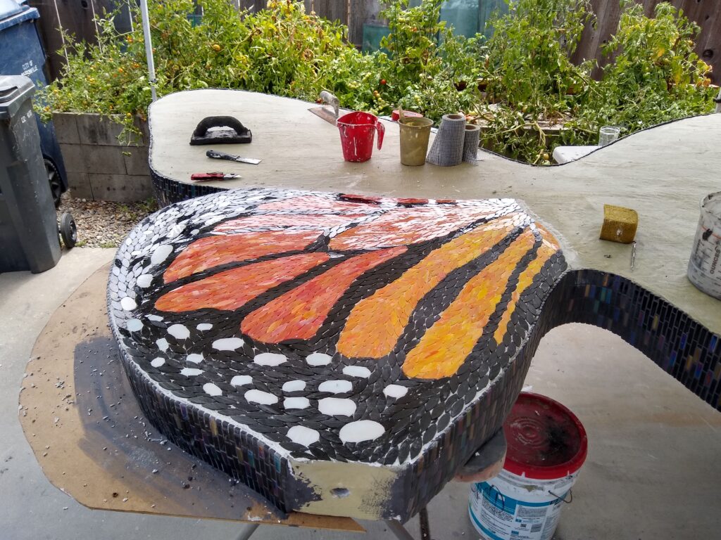 Kathleen constructed the butterfly. The glass tile mosaics were fabricated in the Community Arts & Empowerment studio with community volunteers. Monica made the handmade ceramic tile marigolds in her studio. The community was invited to choose a marigold and place it on the butterfly during on-site installation.