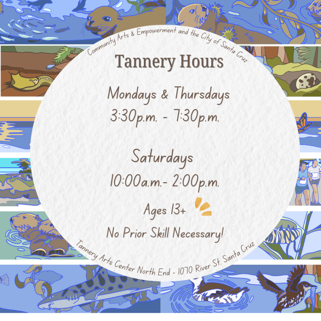 We are currently working on a mosaic for the City of Santa Cruz and are currently working in a satellite studio at the Tannery Arts Center located at 1070 River Street.