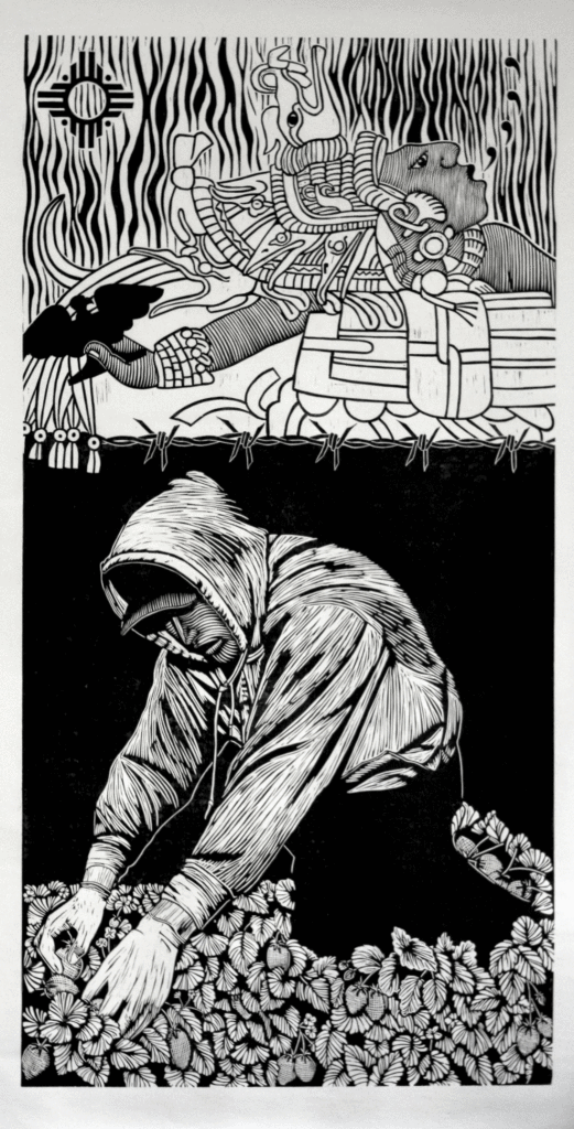 Mayan Warrior, is a woodcut. The main image represents a young man picking strawberries. That young man could have been me, but also many others. I wanted to represent the present and the past, so I added the Mayan deity on top and it holds onto a farmworker eagle and their struggle for workers rights led by Cesar Chavez. On the top left corner is the symbol for the four directions from New Mexico, where I was born. This represents our cultural past in Mexico and present lives in the U.S. Separating the two figures is a barbed wire, representing the border between Mexico and the U. S. My own family was divided with relatives on both sides of the border.