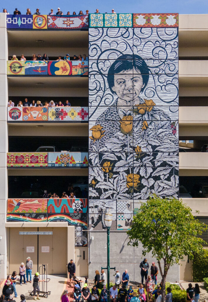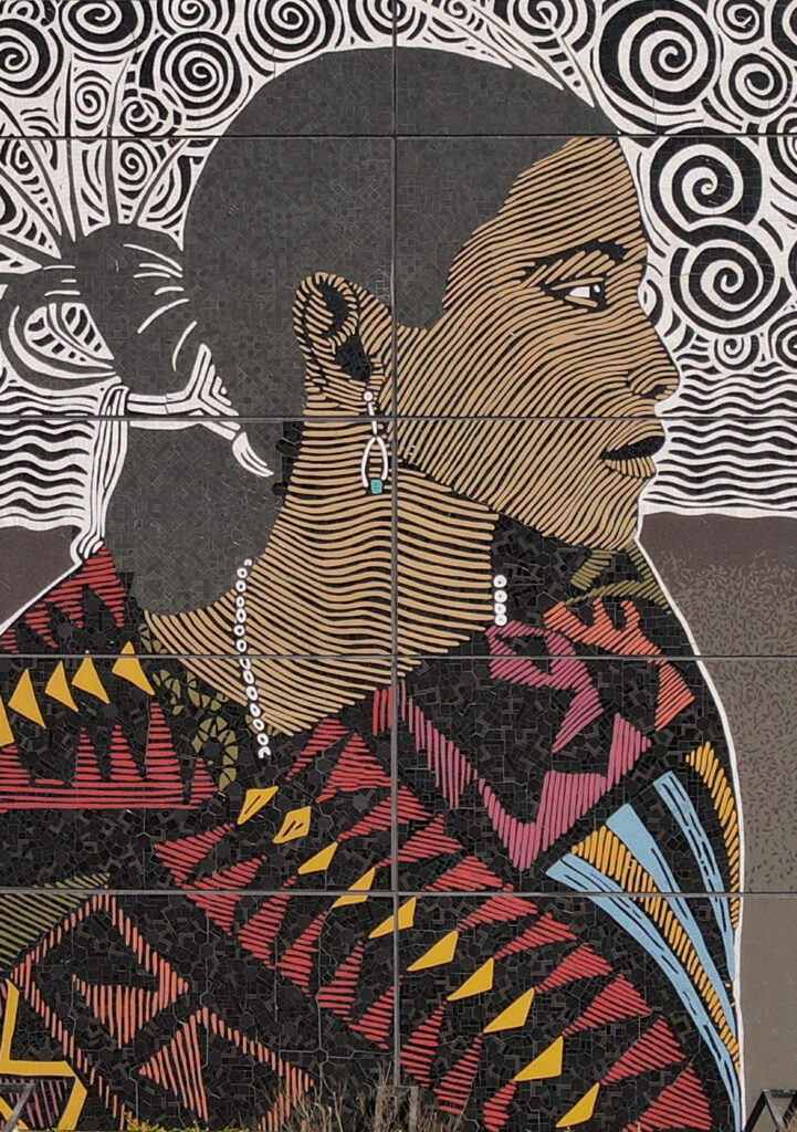 Hermanita was done as a tribute to Native women, but when I titled it Hemanita, (little sister) I was thinking of my sisters, even though they are older than me. Hermanita represents beauty and strength. The resilience of native cultures, but as a mosaic she now represents the first peoples of Watsonville, which were the Ohlone and the many indigenous women that come from Mexico to toil in the fields.